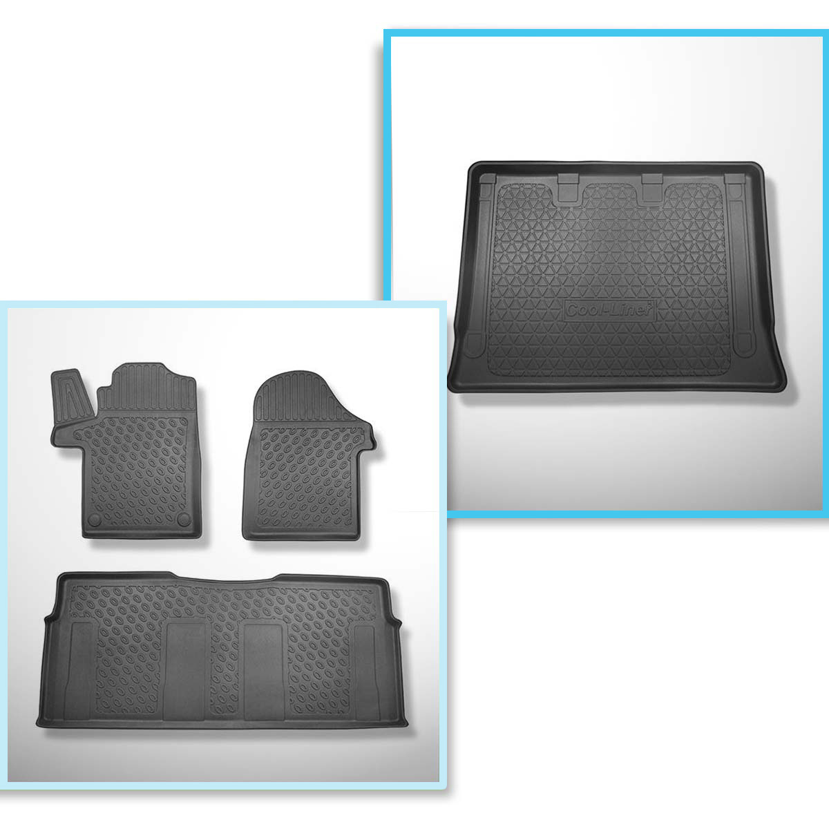 Completo di tappetini e tappetino per bagagliaio TPE PREMIUM per: Mercedes-Benz Vito W447 10.2014-.... (Tourer) - versione Extra lunga (Extra Long) (interasse 3430 mm; lunghezza auto 5370 mm); senza divisioni nel bagagliaio; senza terza fila