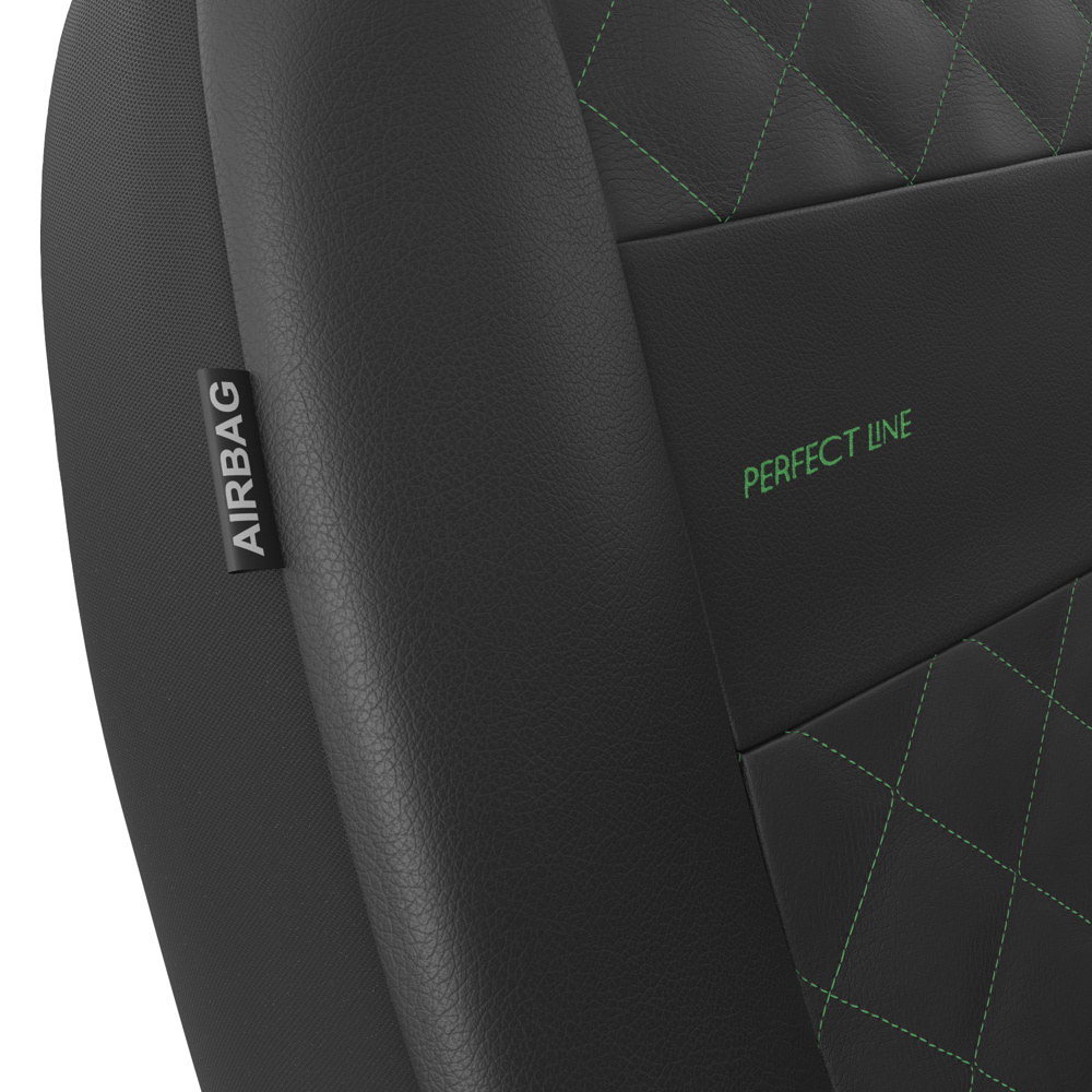- I coprisedili sono realizzati con similpelle di colore nero resistente all'usura e alle macchie, e nella parte centrale possiedono una trapuntatura decorativa con filo in colore verde. I coprisedili anteriori sono ulteriormente decorati con un ricamo.