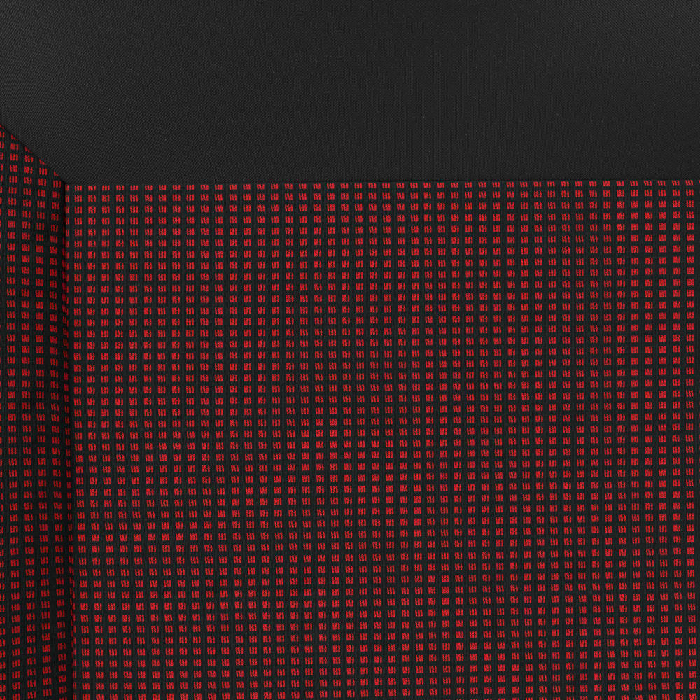 - I coprisedili sono realizzati con tessuto per tappezzeria in colore nero con un inserto jacquard in colore rosso nella parte centrale.